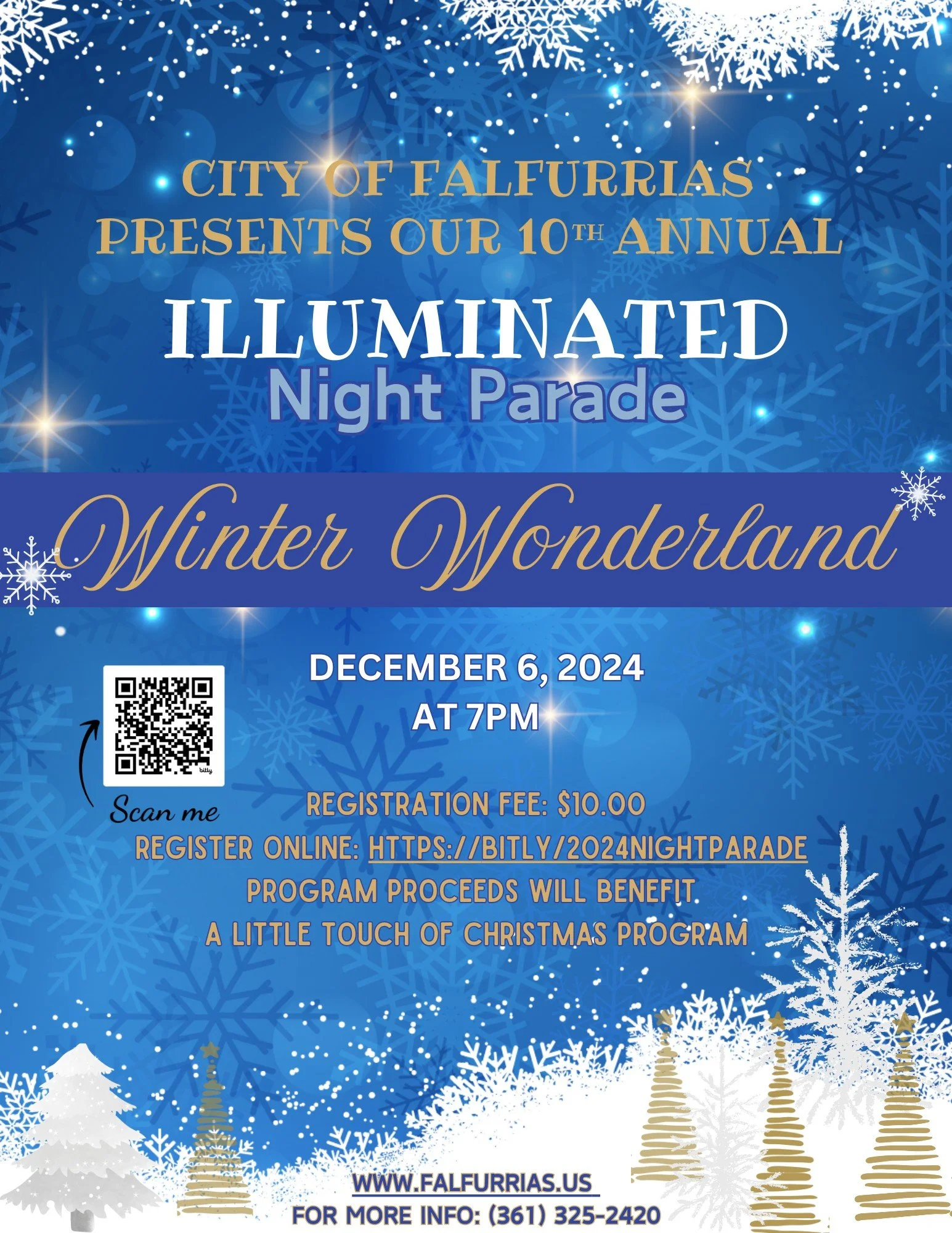 Get ready for a magical evening as the City of Falfurrias presents their 10th Annual Illuminated Night Parade with a special Winter Wonderland theme. Mark your calendars for December 6, 2024, at 7 PM and come celebrate the holiday season with us.