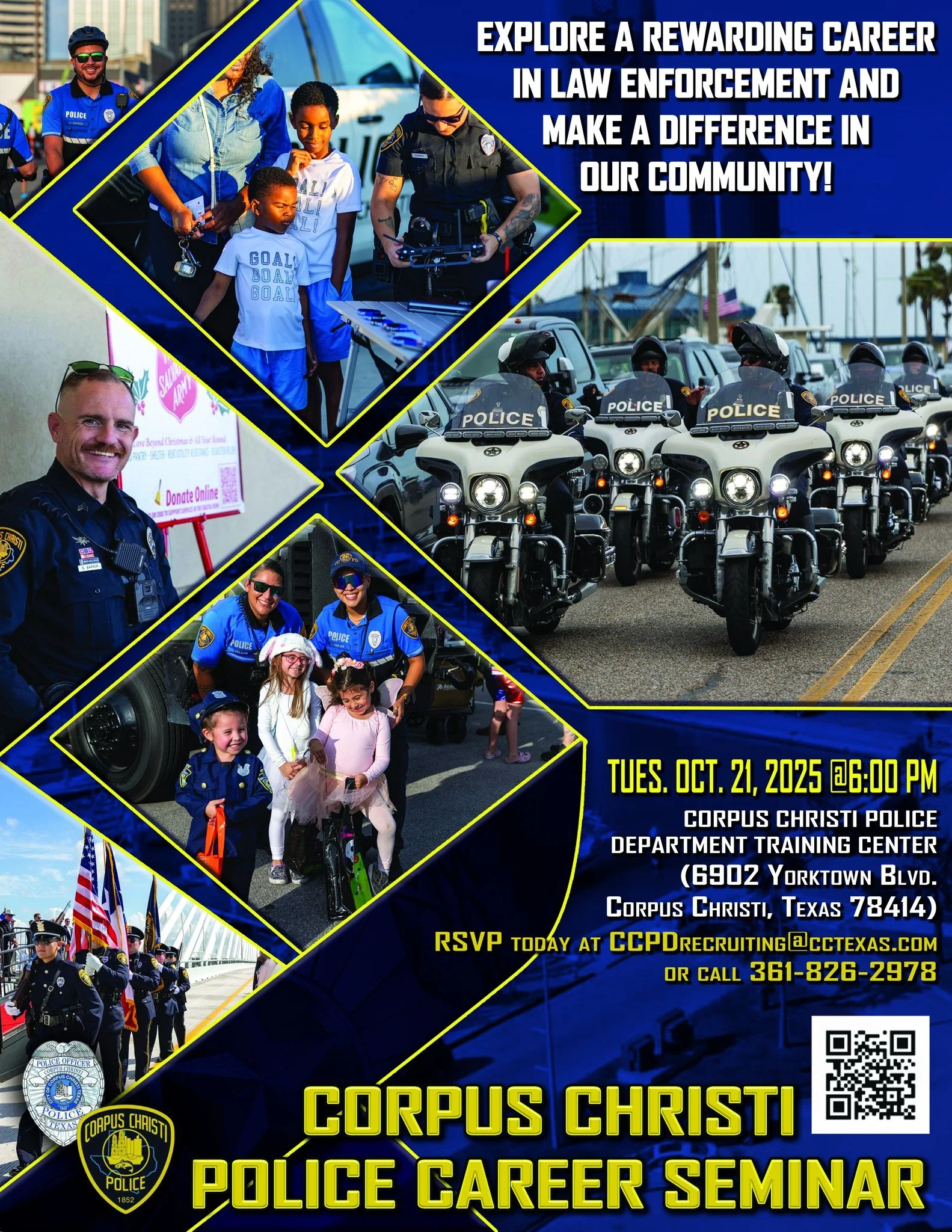 The Corpus Christi Police Department is hosting a Career Seminar on Tuesday, October 21, 2025, at the CCPD Training Center (6902 Yorktown Blvd). The seminar begins at 6 pm and is a great opportunity to learn more about a career with CCPD.