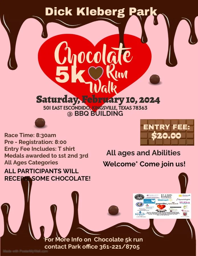 Back to All Events Chocolate 5K Run Saturday, February 10, 2024 8:00 AM 10:00 AM Dick Kleberg Park - BBQ Bldg. 501 East Escondido Road Kingsville, TX, 78363 United States (map) Google Calendar ICS Registration for the Chocolate 5K is $20! We guarantee chocolate and surprises for all participants. Sign yourself and your sweetie up and join us for this fun morning in Dick Kleberg Park!