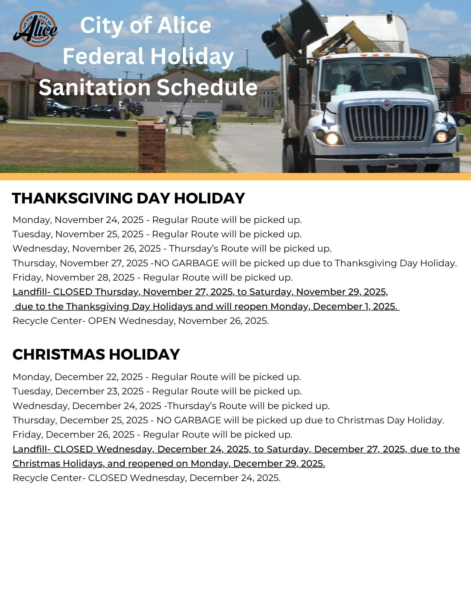 Thanksgiving and Christmas Holiday Sanitation Schedule for the City of Alice.