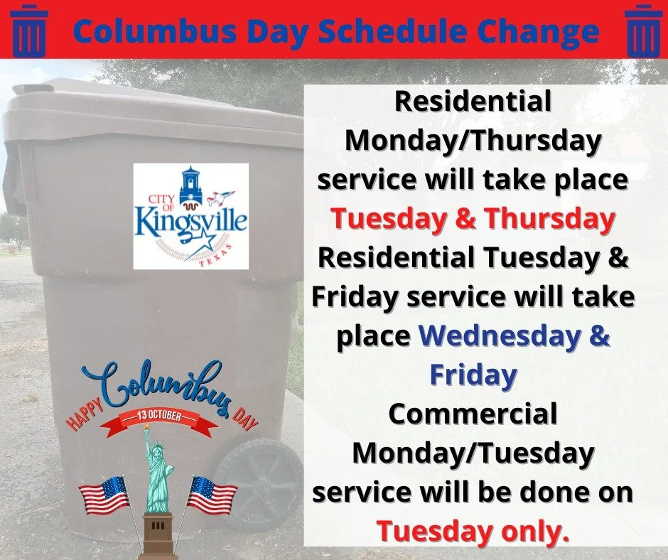 The City of Kingsville Sanitation, City Hall and other Administrative Offices will be closed on Monday, October 13th, 2025 in observance of Columbus Day.