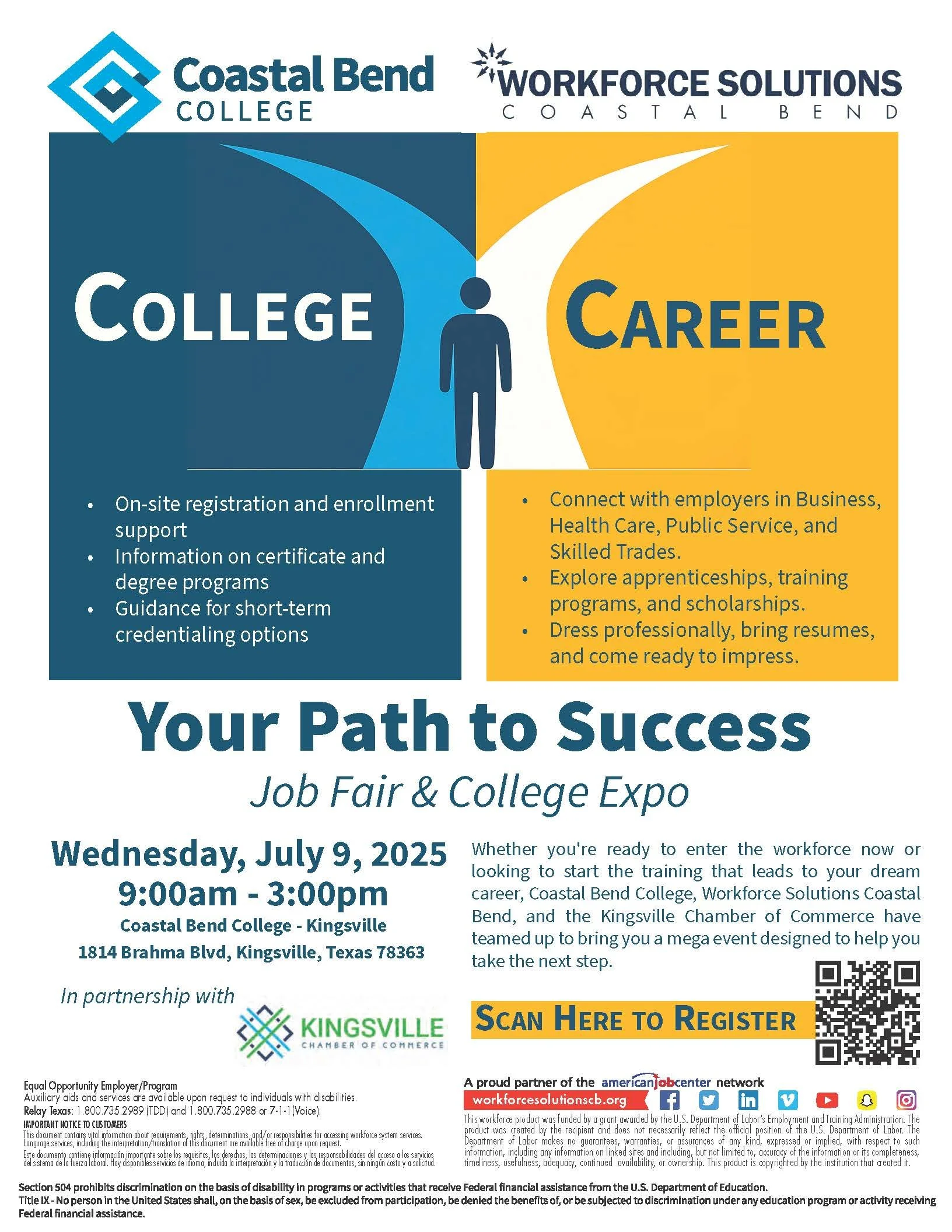 Job fair event will be held on Wednesday, 7/9/2025, from 9:00 am - 3:00 pm at Coastal Bend College located at 1814 S. Brahma Blvd, Kingsville, TX 78363.