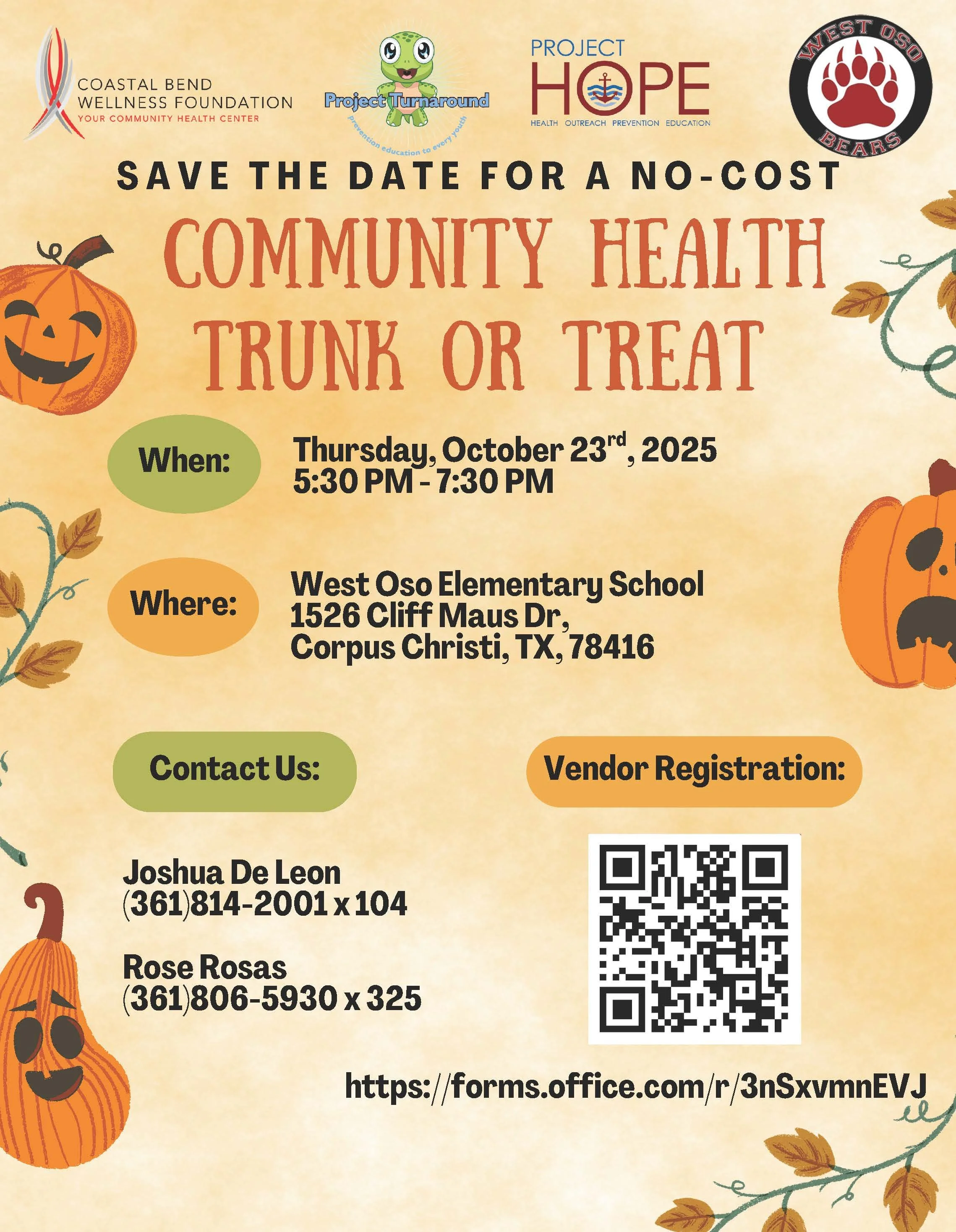 The Youth Programs Department at the Coastal Bend Wellness Foundation will host their annual Community Health Trunk or Treat, taking place in partnership with West Oso Elementary School on Thursday, October 23, 2025, from 5:30 PM to 7:30 PM at 1526 Cliff Maus Dr., Corpus Christi, TX 78416.