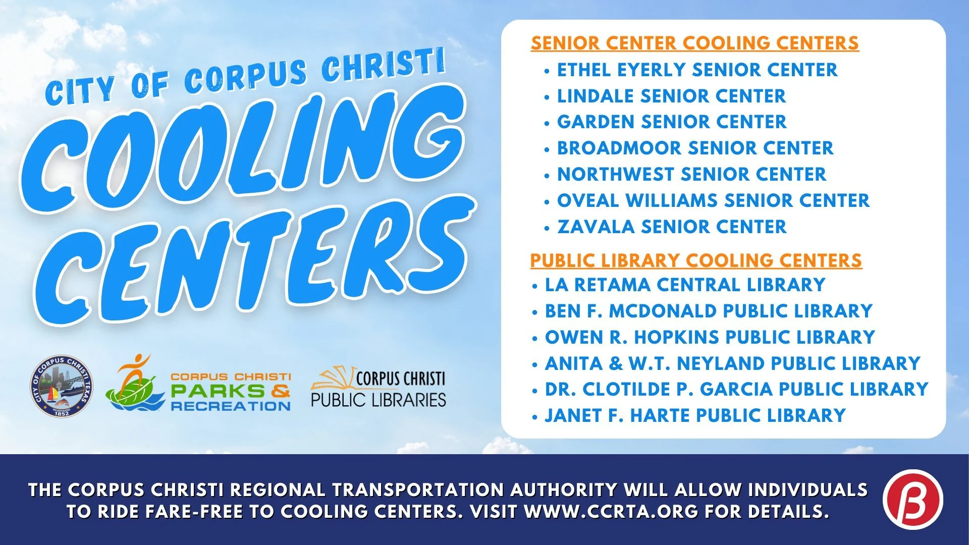 The Corpus Christi Regional Transportation Authority will also allow individuals to ride fare-free upon telling their Bus Operator they will travel to the nearest cooling center. The return trip is also free. For more information, go to http://www.ccrta.org.