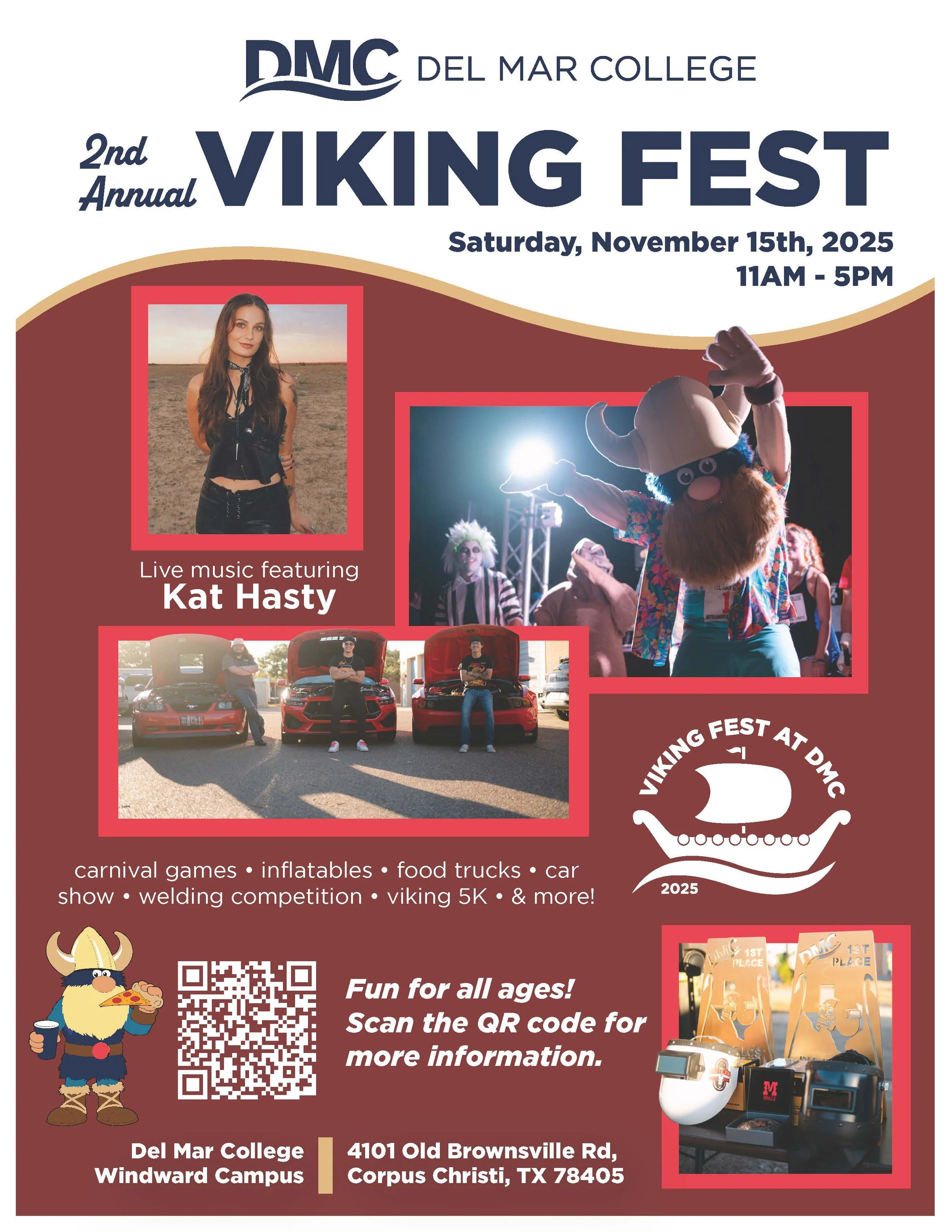 Del Mar College’s second annual Viking Fest is building on the success of the first event held in October 2024. Organizers are putting together an amped-up Viking Fest 2025 scheduled for Saturday, Nov. 15, from 11 a.m. to 5 p.m. on the Windward Campus (4101 Old Brownsville Rd., 78404).