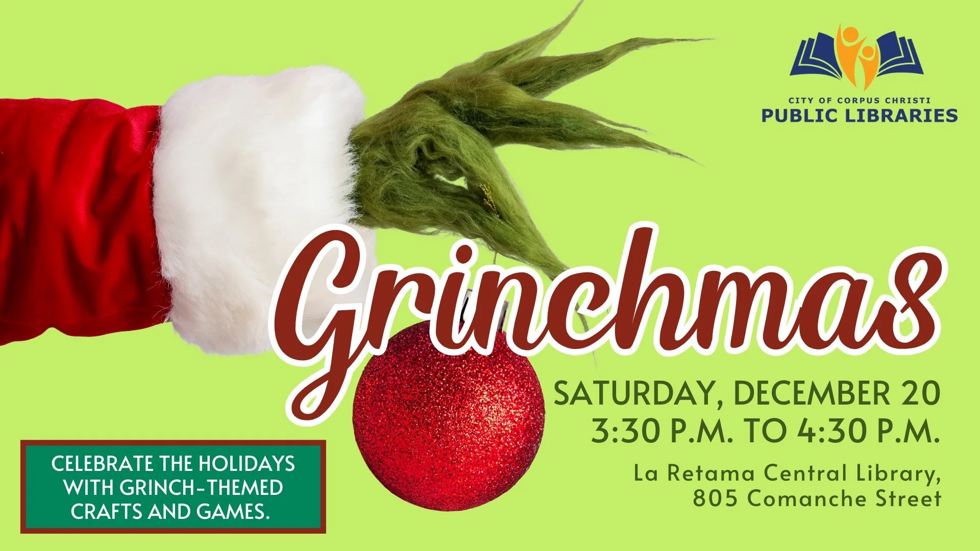 Get ready for an afternoon of fun featuring Grinch-themed crafts and games.