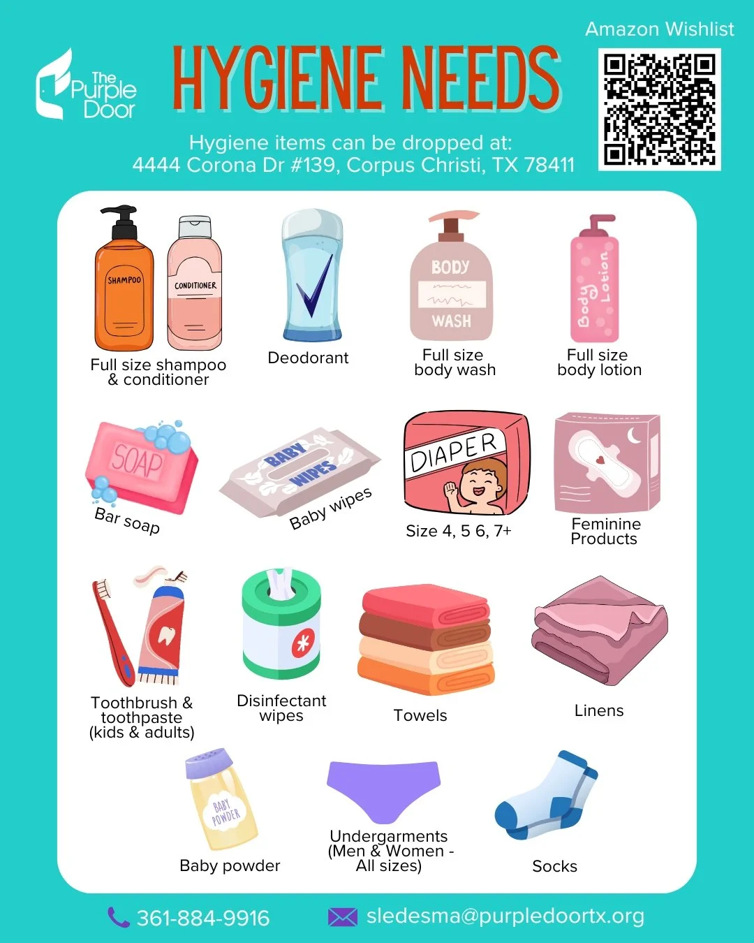 The Purple Door shelter and outreach offices are in need of full-size hygiene items. Donations of everyday essentials like shampoo, soap, deodorant, toothpaste, and feminine hygiene products are greatly appreciated. Thank you for supporting those we serve.