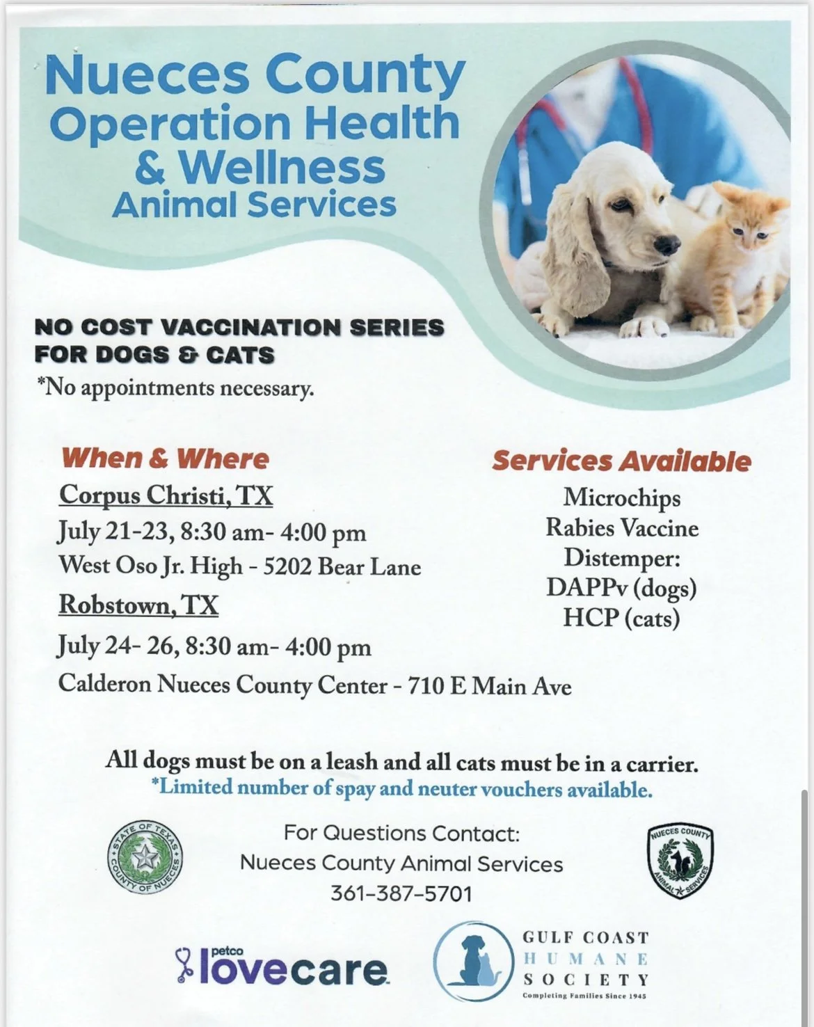 Nueces County Operation Health & Wellness Offering no cost veterinary services to the Public.