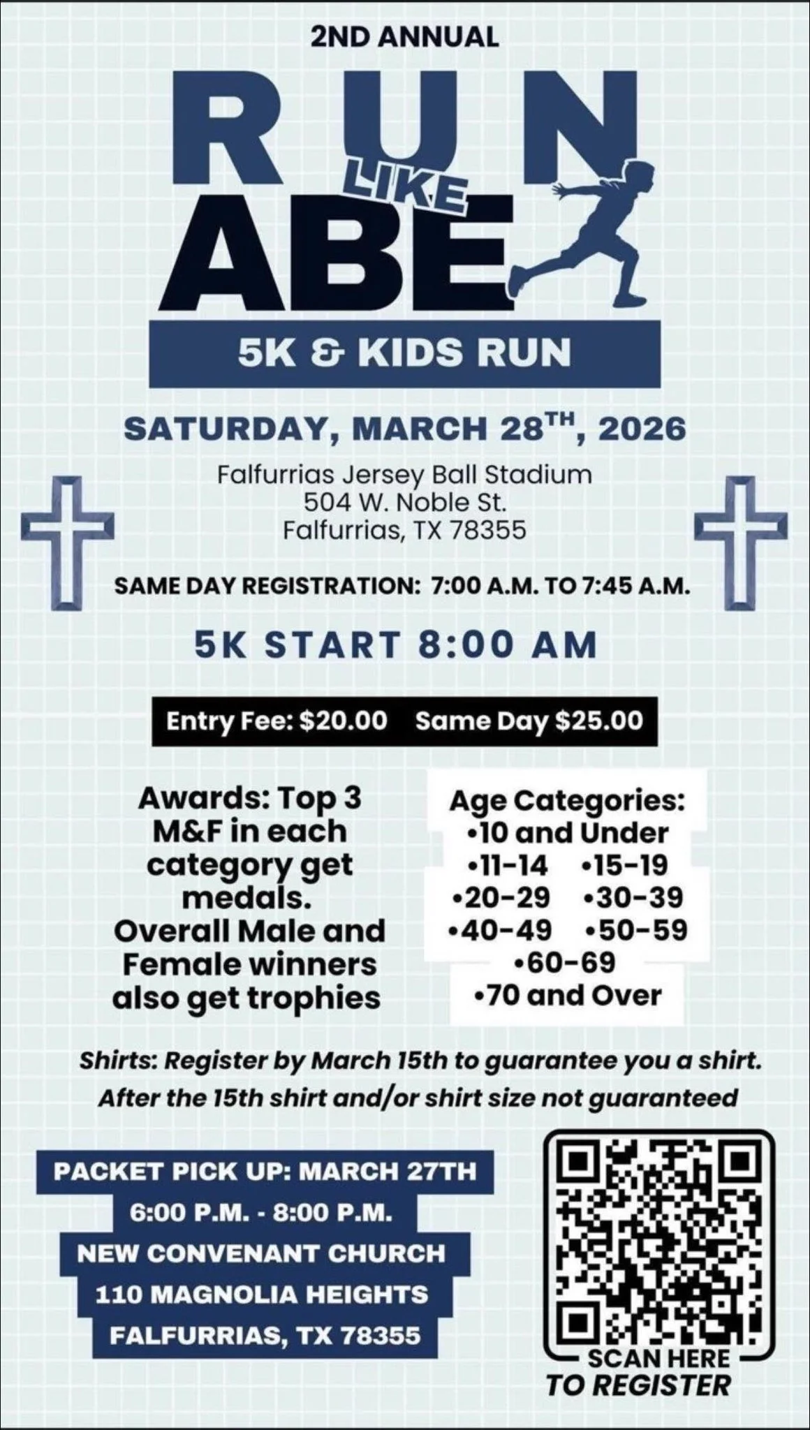 Run Like Abe Saturday, March 28, 2026 7:00 AM 10:00 AM Falfurrias Baseball Stadium 504 West Noble Street Falfurrias, TX, 78355 United States (map) Google Calendar ICS 2nd Annual Run Like Abe 5K & Kids RunSaturday, March 28, 2026More than just a race, this event is about coming together as a community—running with purpose, honoring a meaningful cause, and supporting one another every step of the way.