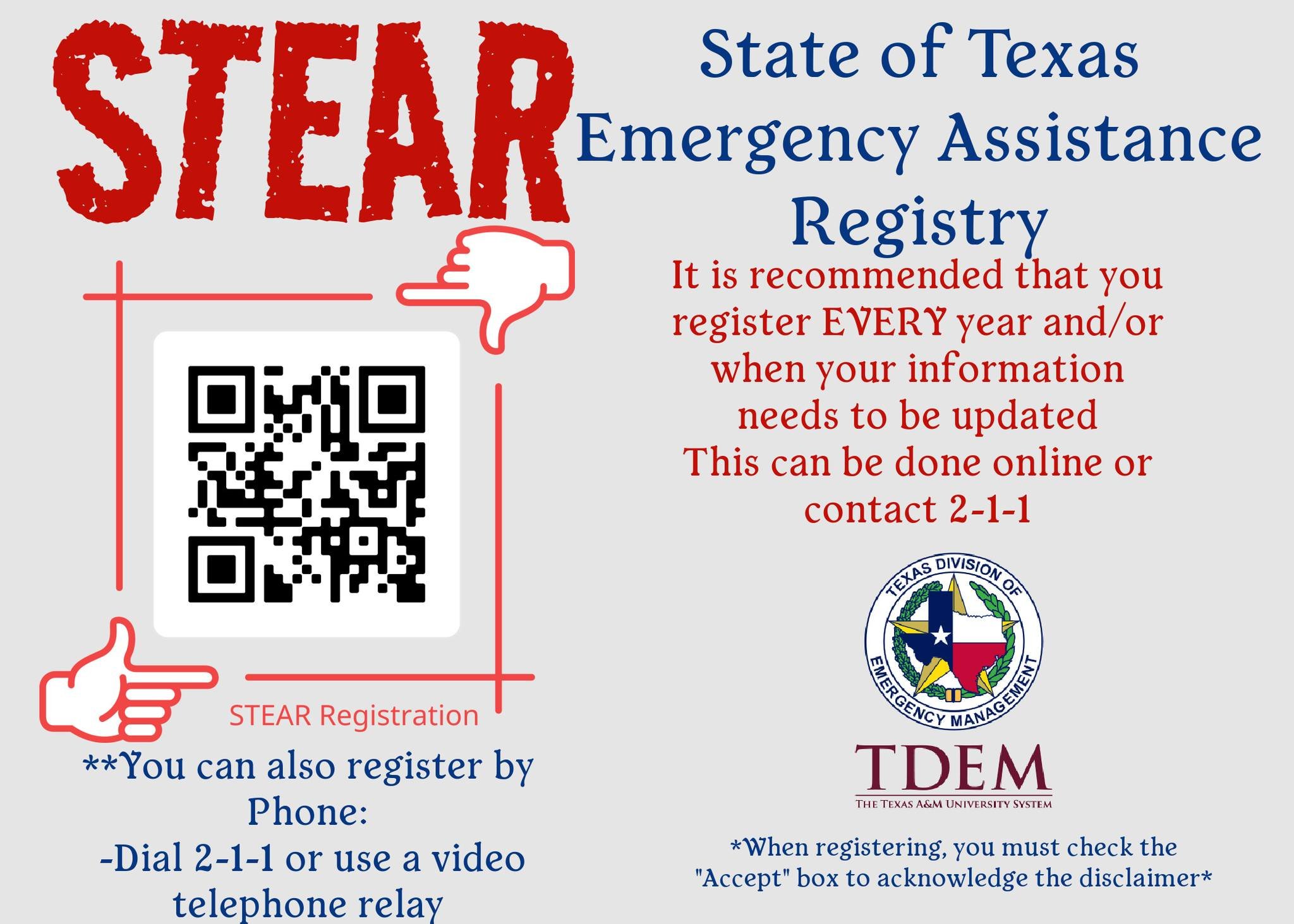 Registering yourself or a loved one in the STEAR registry DOES NOT guarantee that you will receive a specific service during an emergency.