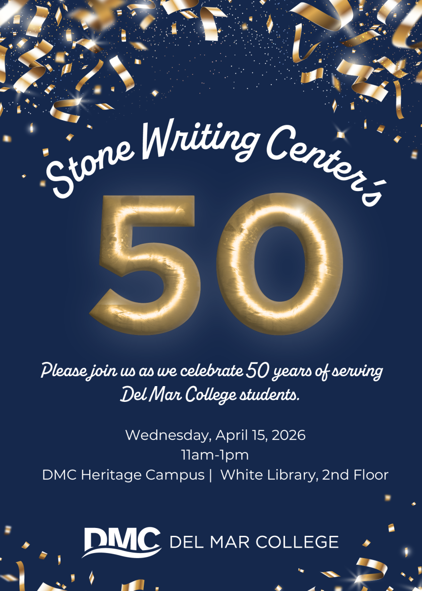 • Wednesday, April 15, 11 a.m. to 1 p.m., Del Mar College Stone Writing Center 50th Anniversary Celebration. • Location: Second Floor, William F. White, Jr. Library, DMC Heritage Campus, 101 Baldwin Blvd. (78404), get online directions and campus map. • Cost: Free. • Questions? Contact the DMC Stone Writing Center at 361-698-1364 or swc@delmar.edu.