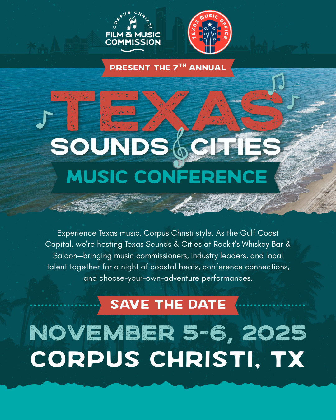 The 7th Annual Texas Sounds & Cities Conference will take place November 5–6, 2025, in Corpus Christi, bringing together stakeholders from across the state to celebrate and strengthen the impact of Texas music. Hosted by the City of Corpus Christi, Visit Corpus Christi, the Corpus Christi Music Commission, and the Texas Music Office, the conference serves as a central meeting point for Music Friendly Texas Certified Communities. Attendees will engage in dynamic discussions focused on growing local music economies, enhancing music tourism, and building stronger cross-city collaboration. Participants will also hear updates from state programs, grants, and industry leaders, with ample time set aside for networking, collaboration, and idea sharing.