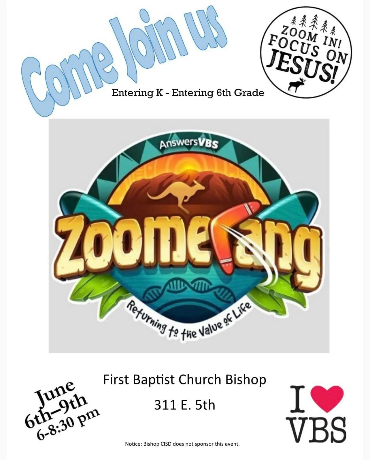Back to All Events VBS - Zoomerang at Bishop First Baptist Church Monday, June 6, 2022 6:00 PM Thursday, June 9, 2022 8:30 PM Bishop First Baptist Church 311 East 5th Street Bishop, TX, 78343 United States (map) Google Calendar ICS