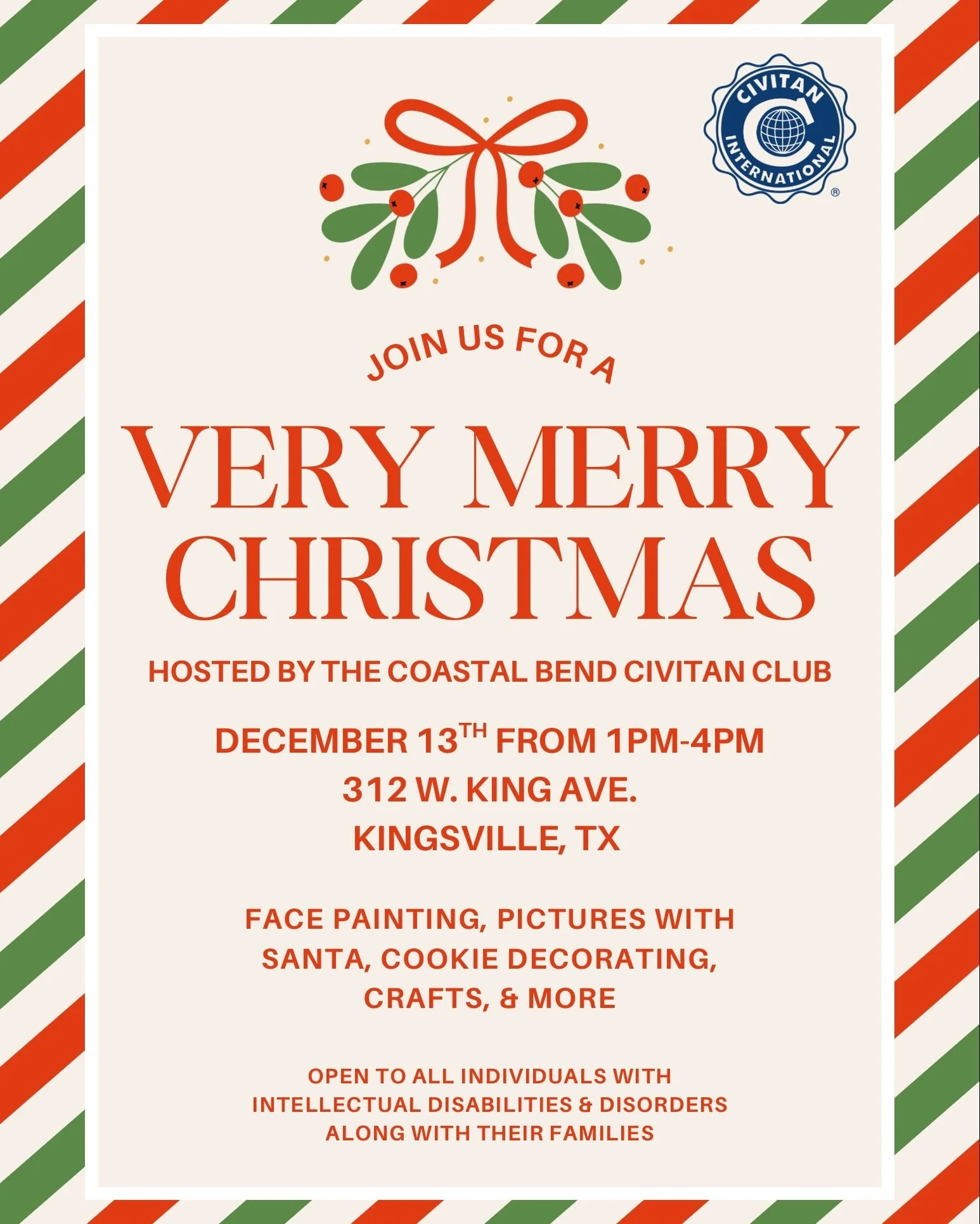 Very Merry Christmas 2025 Saturday, December 13, 2025 1:00 PM 4:00 PM First Baptist Church Kingsville 312 West King Avenue Kingsville, TX, 78363 United States (map) Google Calendar ICS The Coastal Bend Civitans will host their annual Very Merry Christmas celebration on Saturday, December 13, 2025 for all individual with intellectual disabilities and their families.