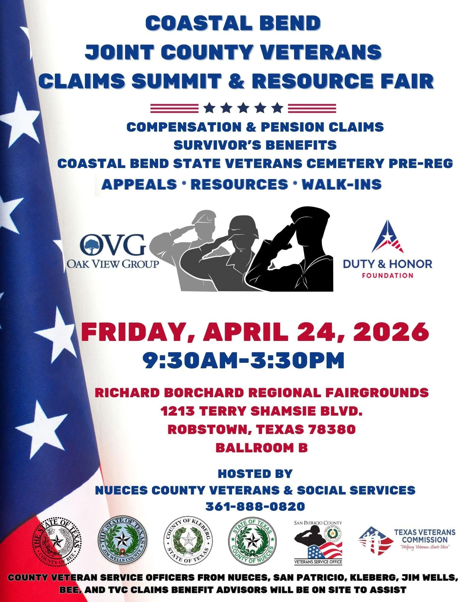 Attention Veterans, Dependents, and Veterans Survivors of the Coastal Bend are invited to attend the Coastal Bend Joint County Veterans Claims Summit & Resource Fair on Friday, April 24, 2026, from 9:30 AM – 3:30 PM at the Richard Borchard Regional Fairgrounds (Ballroom B) in Robstown.