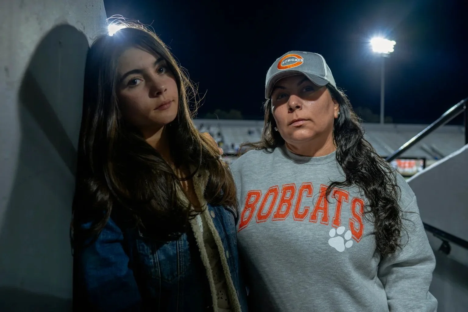 Aspen and Sasha Follett at the Celina varsity football game on Nov. 21, 2025. Johnathan Johnson for The Texas Tribune