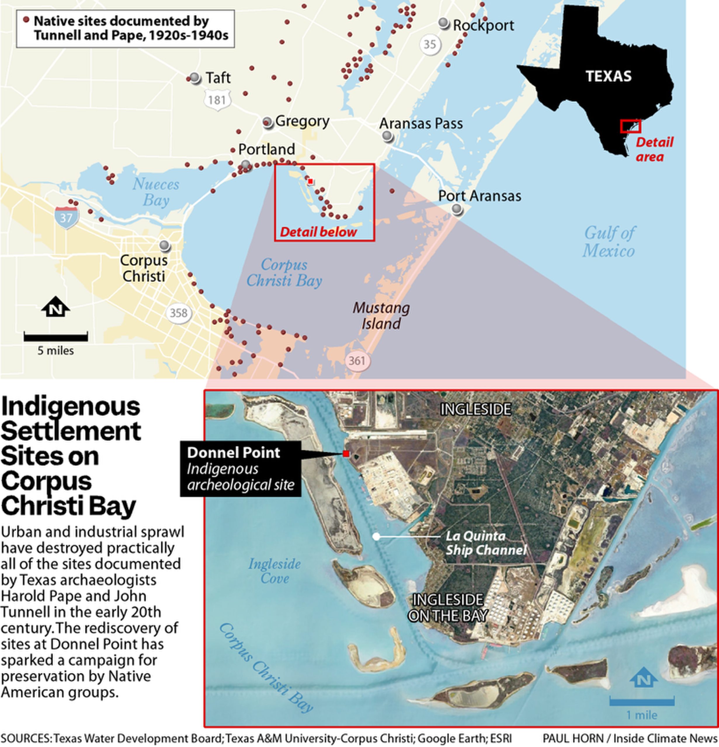 Moore consulted the research of two local archaeologists, a father and son-in-law duo named Harold Pape and John Tunnell who documented hundreds of Indigenous cultural sites around nearby bays in the 1920s, ‘30s and ‘40s, including a string of particularly dense settlements on the north shore of Corpus Christi Bay. Their work was only published in 2015 by their descendents, John Tunnell Jr. and his son Jace Tunnell, both professors at A&M.