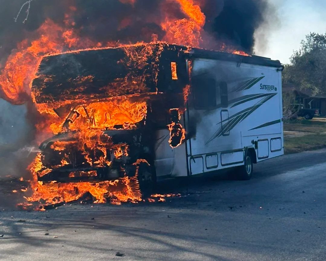 Officials reported that the vehicle contained propane tanks, which exploded during the fire. Tires also blew out, creating additional safety concerns. Law enforcement and emergency personnel quickly established traffic control in the area while crews worked to secure the scene.